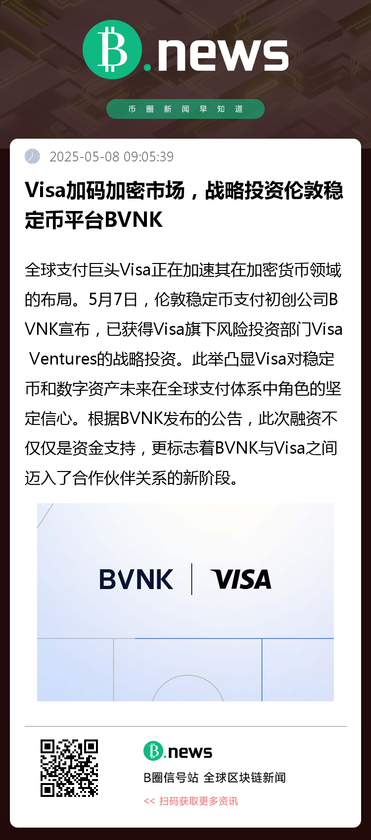 全球支付巨头Visa正在加速其在加密货币领域的布局。5月7日,伦敦稳定币支付初创公司BVNK宣布,已获得Visa旗下风险投资部门Visa Ventures的战略投资。此举凸显Visa对稳定币和数字资产未来在全球支付体系中角色的坚定信心。