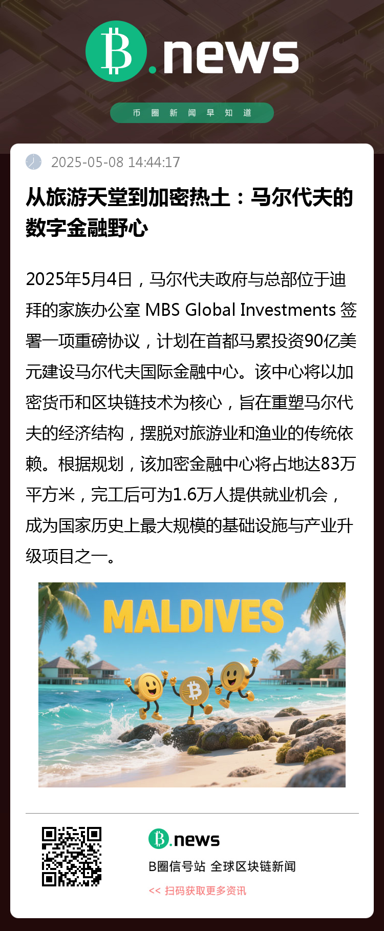 2025年5月4日,马尔代夫政府与总部位于迪拜的家族办公室 MBS Global Investments 签署一项重磅协议,计划在首都马累投资90亿美元建设马尔代夫国际金融中心。该中心将以加密货币和区块链技术为核心,旨在重塑马尔代夫的经济结构,摆脱对旅游业和渔业的传统依赖。