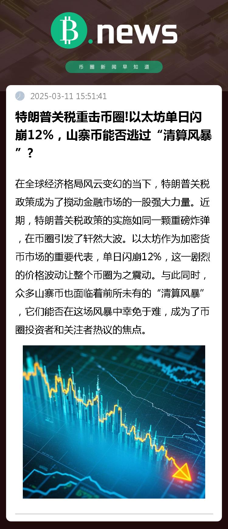 在全球经济格局风云变幻的当下,特朗普关税政策成为了搅动金融市场的一股强大力量。近期,特朗普关税政策的实施如同一颗重磅炸弹,在币圈引发了轩然大波。以太坊作为加密货币市场的重要代表,单日闪崩12%,这一剧烈的价格波动让整个币圈为之震动。与此同时,众多山寨币也面临着前所未有的“清算风暴”,它们能否在这场风暴中幸免于难,成为了币圈投资者和关注者热议的焦点。