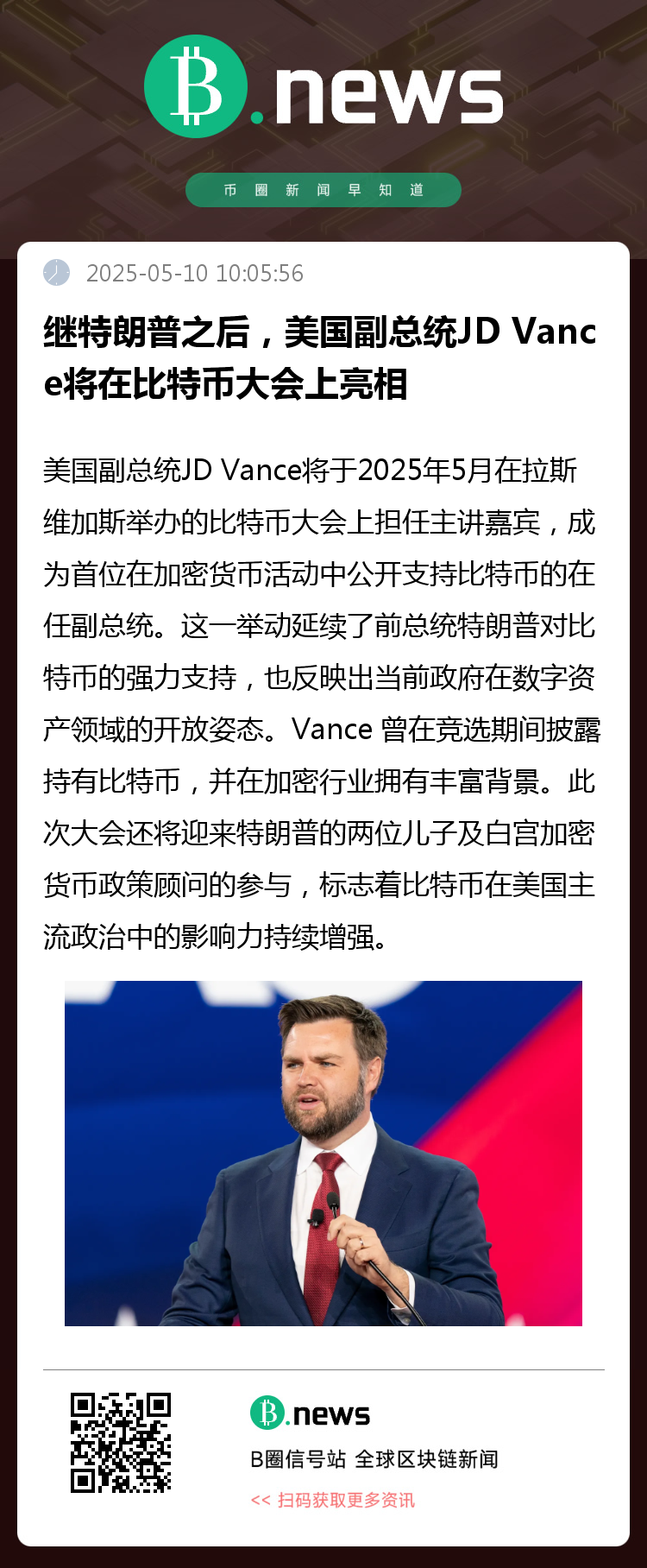 在美国前总统唐纳德·特朗普曾为比特币大会站台之后,现任副总统JD Vance将于2025 年比特币大会上担任主讲嘉宾,成为首位在加密货币活动中公开支持比特币的在任副总统。