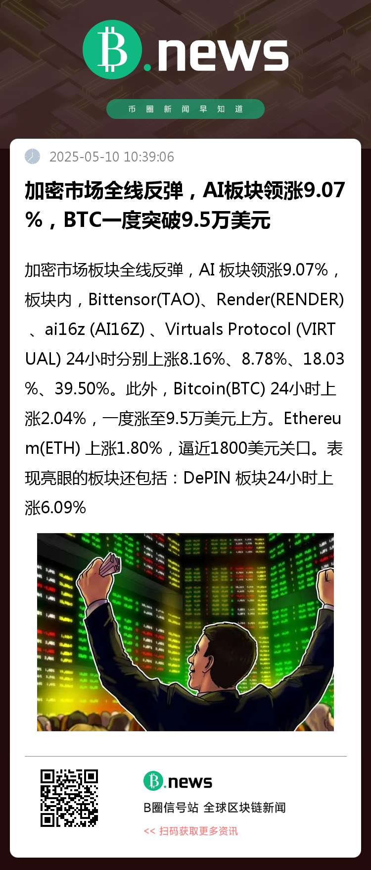 加密市场板块全线反弹,AI 板块领涨9.07%,板块内,Bittensor(TAO)、Render(RENDER) 、ai16z (AI16Z) 、Virtuals Protocol (VIRTUAL) 24小时分别上涨8.16%、8.78%、18.03%、39.50%。此外,Bitcoin(BTC) 24小时上涨2.04%,一度涨至9.5万美元上方。Ethereum(ETH) 上涨1.80%,逼近1800美元关口。
