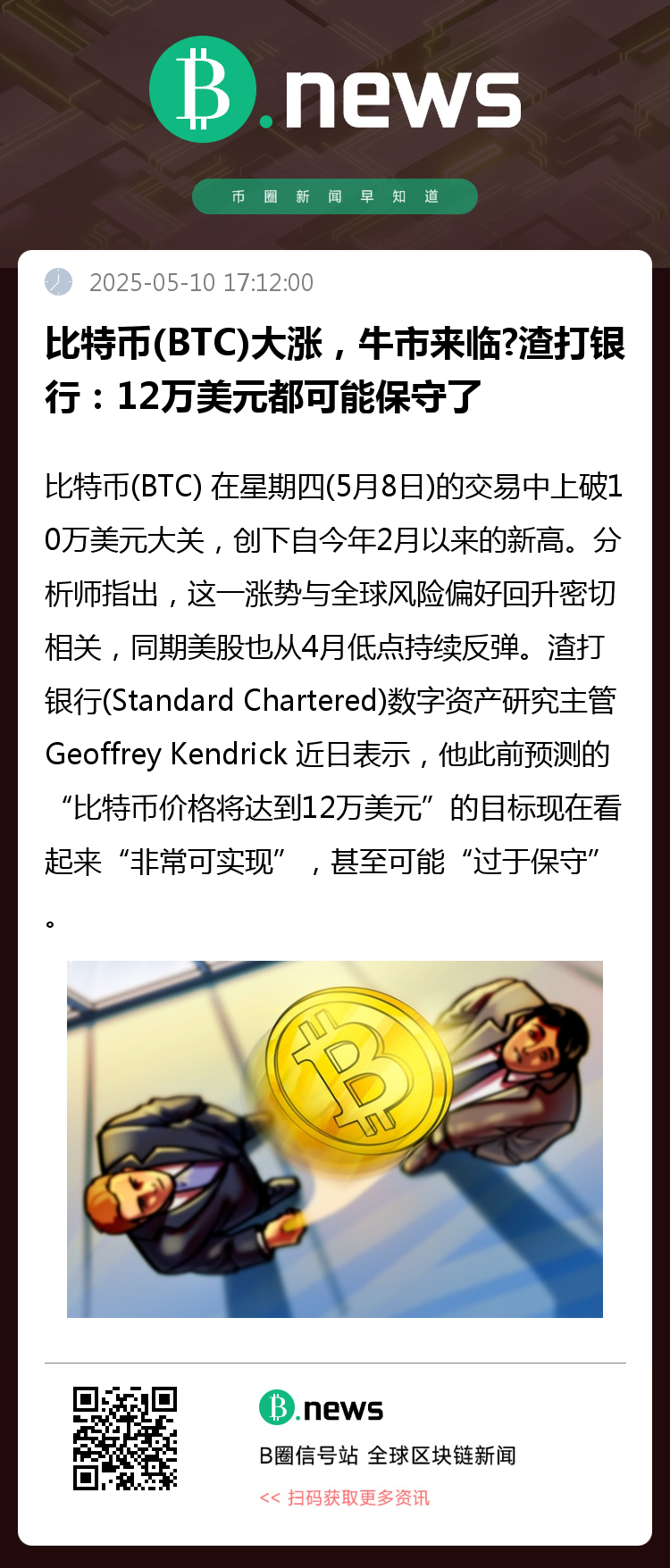 渣打银行(Standard Chartered)数字资产研究主管Geoffrey Kendrick 近日表示,他此前预测的“比特币价格将达到12万美元”的目标现在看起来“非常可实现”,甚至可能“过于保守”。