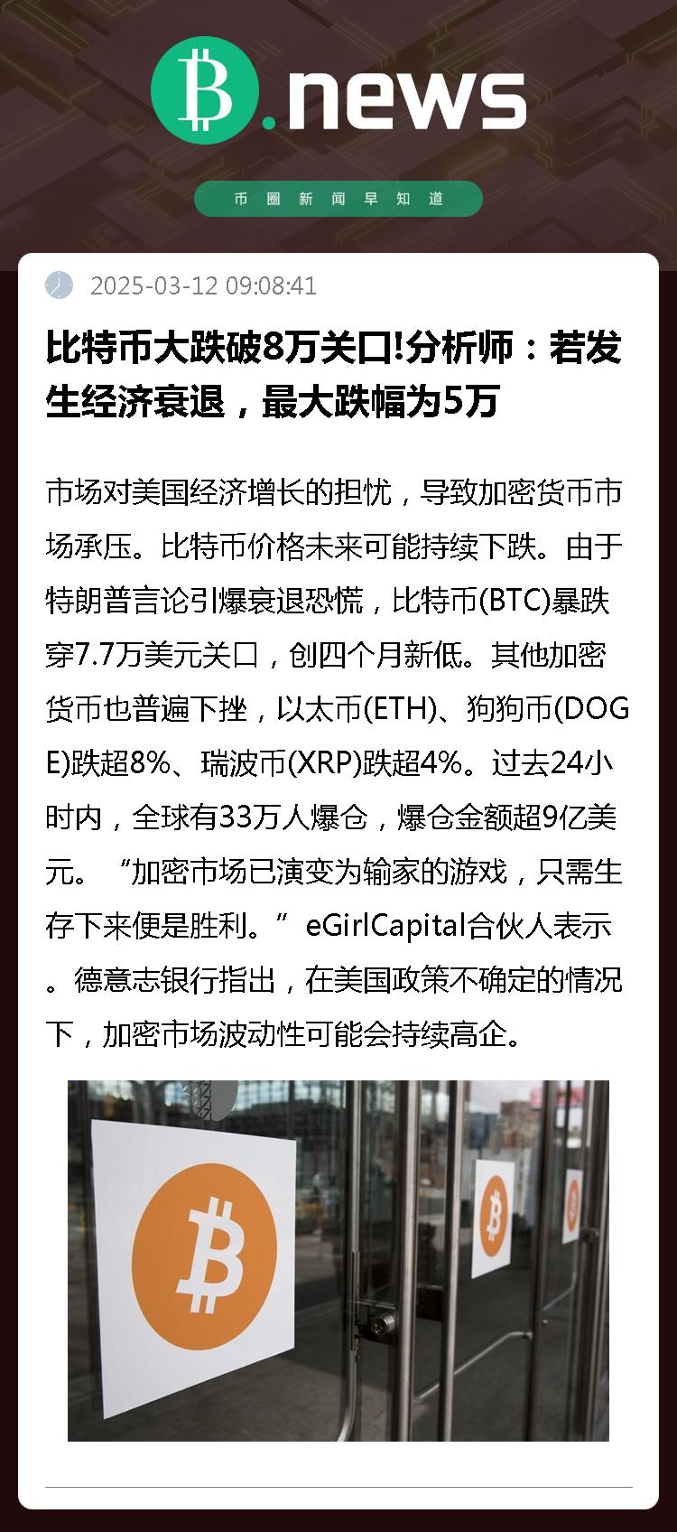 由于特朗普言论引爆衰退恐慌,比特币(BTC)暴跌穿7.7万美元关口,创四个月新低。