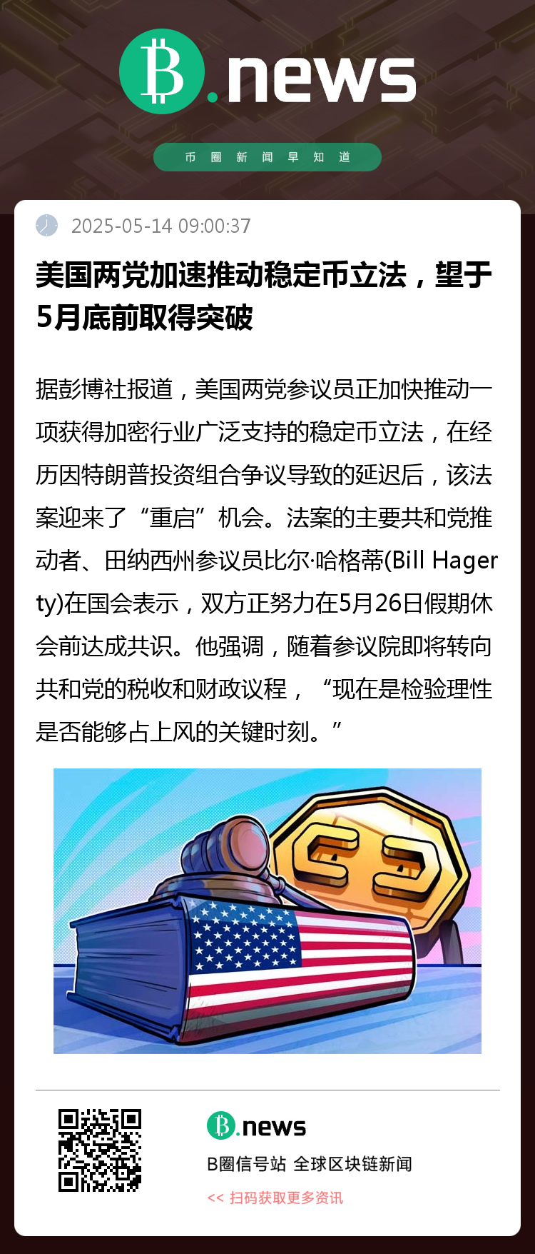 法案的主要共和党推动者、田纳西州参议员比尔·哈格蒂(Bill Hagerty)在国会表示,双方正努力在5月26日假期休会前达成共识。他强调,随着参议院即将转向共和党的税收和财政议程,“现在是检验理性是否能够占上风的关键时刻。”
