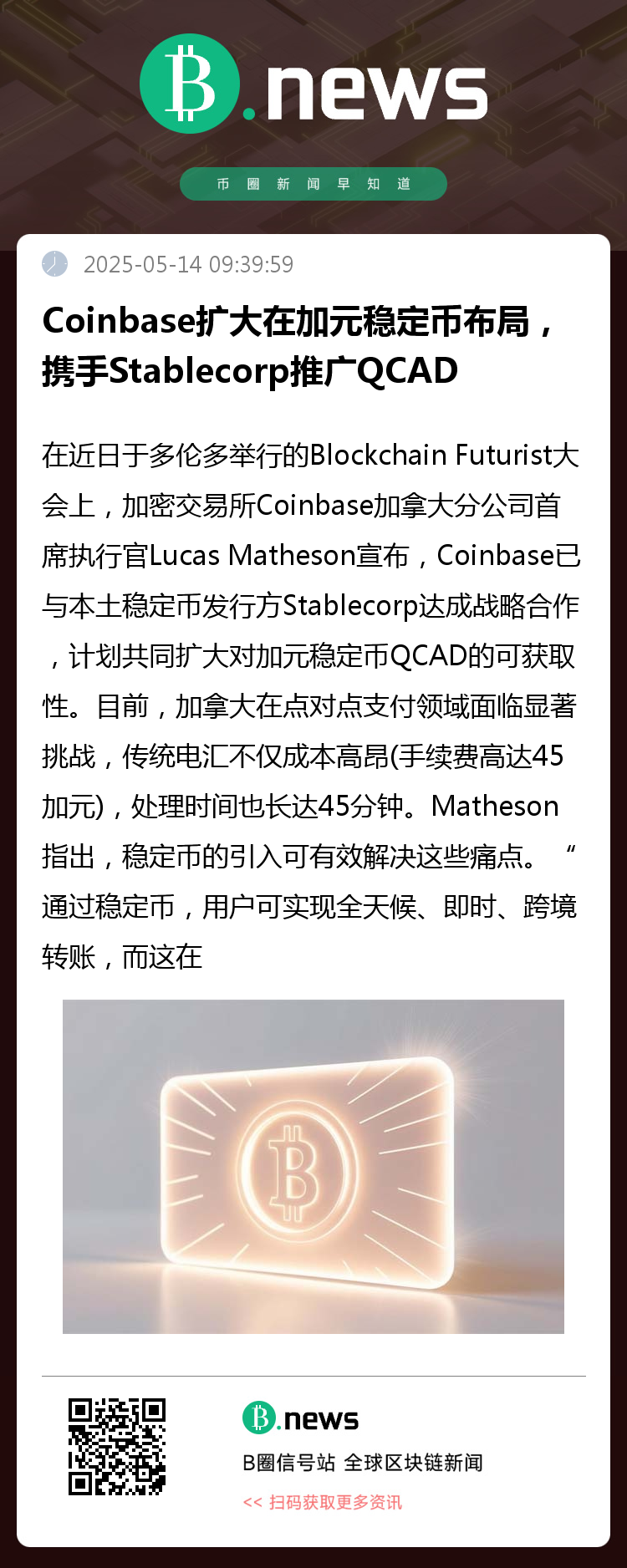 Matheson表示,Coinbase已对Stablecorp进行了金额未公开的投资,并将协助推广其由法币支持的稳定币QCAD,以推动加密支付在加拿大的普及。“我们相信,QCAD是解决加拿大支付基础设施短板的关键一步,”他说。