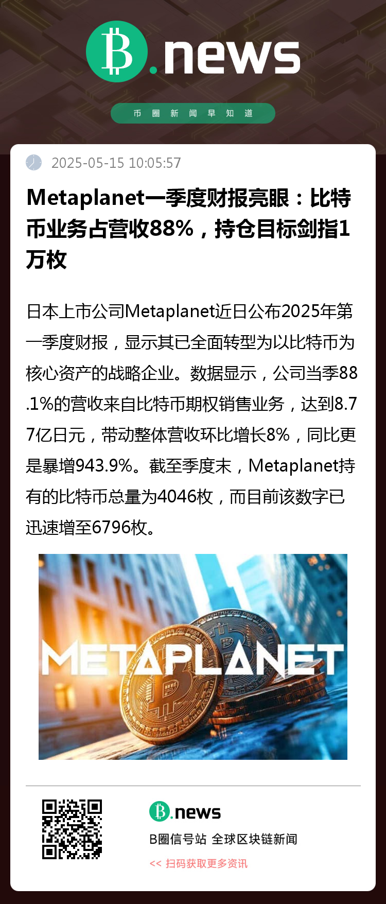 日本上市公司 Metaplanet 近日公布2025年第一季度财报,显示其已全面转型为以比特币为核心资产的战略企业。数据显示,公司当季88.1%的营收来自比特币期权销售业务,达到8.77亿日元,带动整体营收环比增长8%,同比更是暴增943.9%。