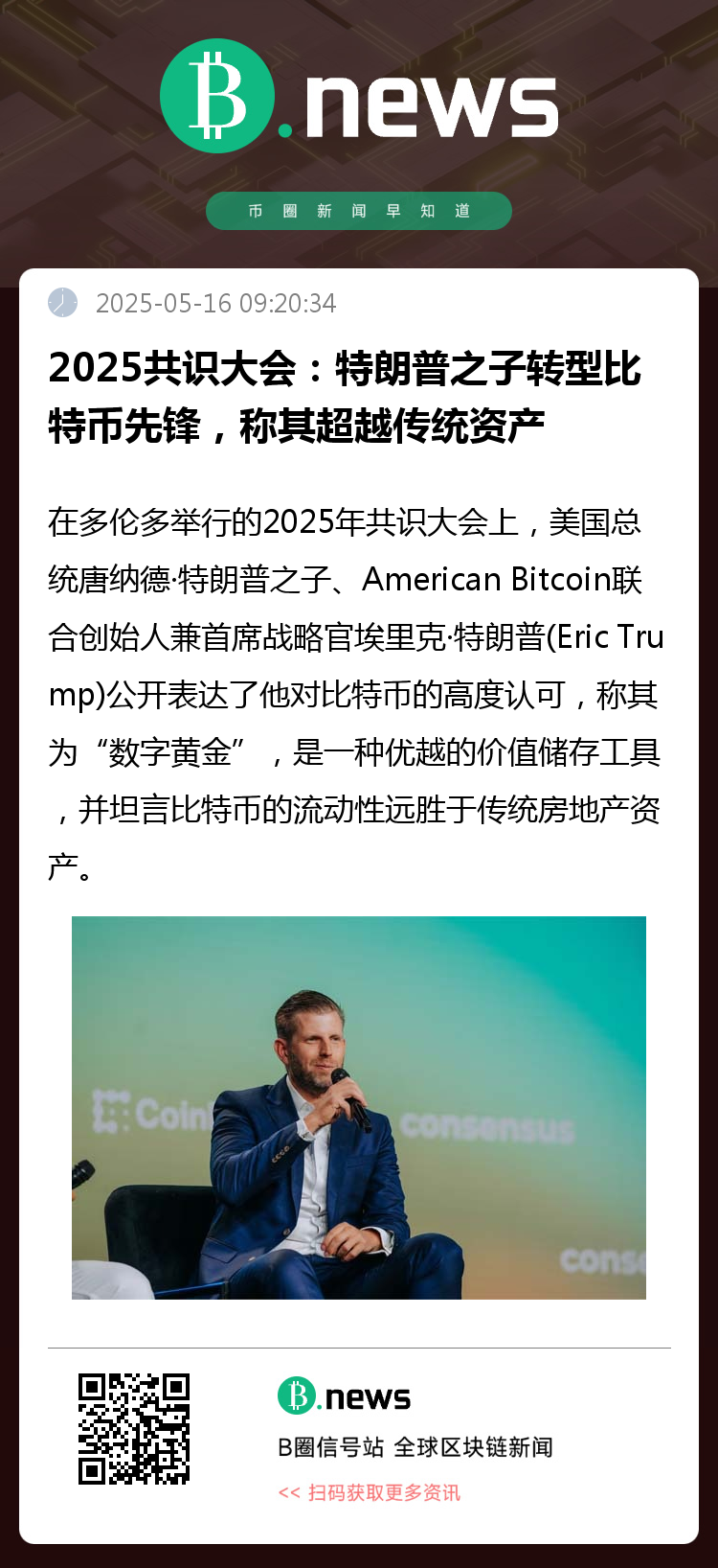 这次公开亮相标志着埃里克·特朗普从传统房地产商转向数字资产先锋的明确转型。他的发言不仅进一步凸显了特朗普家族与比特币的密切关系,也再次点燃了市场对美国比特币政策走向的关注。在父亲唐纳德·特朗普领导下的美国政府也被广泛认为正采取更开放的加密政策路线,试图推动美国产业在全球数字金融竞争中保持领先。