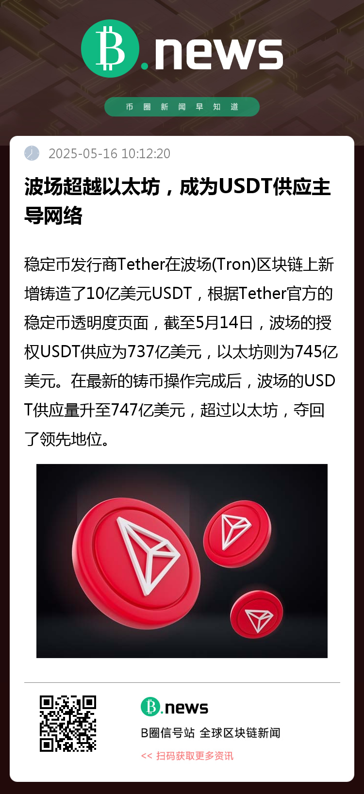 稳定币发行商Tether在波场(Tron)区块链上新增铸造了10亿美元USDT,使得波场网络的授权USDT总量正式超越以太坊,成为目前USDT供应量最多的区块链平台。