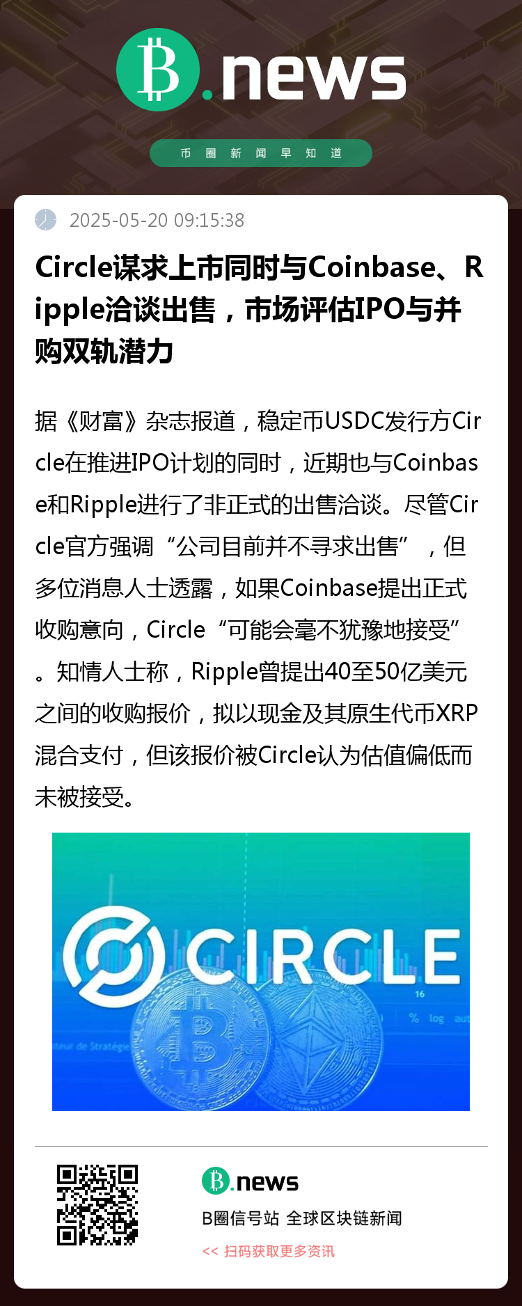 Circle已于2025年4月向美国证券交易委员会(SEC)递交上市申请,目标估值为50亿美元。但在上市程序推进过程中,公司仍保持与潜在战略买家的沟通渠道。知情人士称,Ripple曾提出40至50亿美元之间的收购报价,拟以现金及其原生代币XRP混合支付,但该报价被Circle认为估值偏低而未被接受。