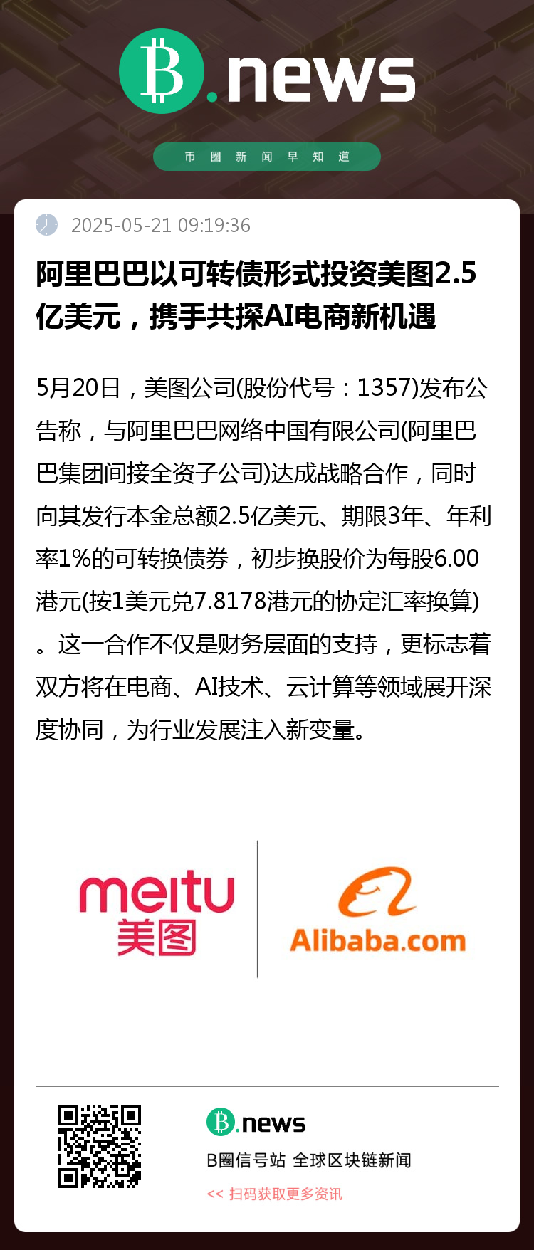5月20日,美图公司(股份代号:1357)发布公告称,与阿里巴巴网络中国有限公司(阿里巴巴集团间接全资子公司)达成战略合作,同时向其发行本金总额2.5亿美元、期限3年、年利率1%的可转换债券,初步换股价为每股6.00港元(按1美元兑7.8178港元的协定汇率换算)。这一合作不仅是财务层面的支持,更标志着双方将在电商、AI技术、云计算等领域展开深度协同,为行业发展注入新变量。