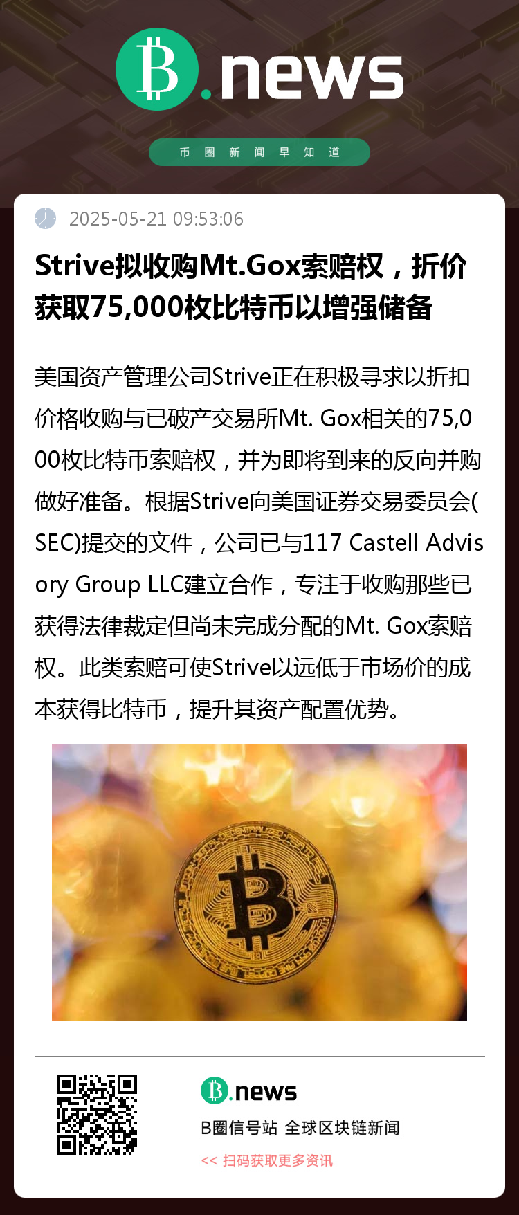 美国资产管理公司 Strive 正在积极寻求以折扣价格收购与已破产交易所 Mt. Gox 相关的 75,000 枚比特币索赔权,此举旨在提升其比特币储备,并为即将到来的反向并购做好准备。