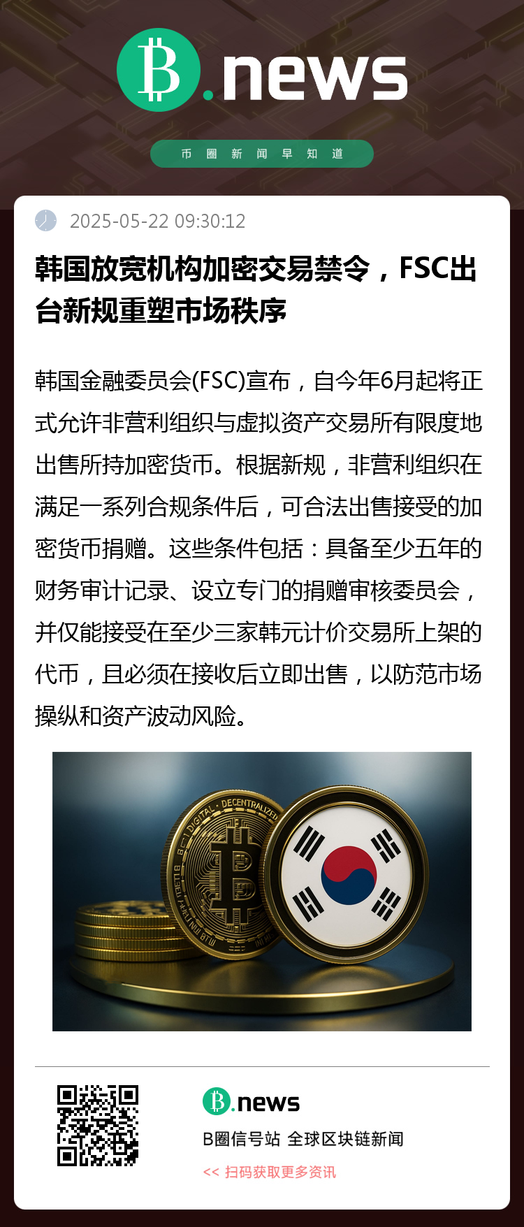 韩国金融委员会(FSC)宣布,自今年6月起将正式允许非营利组织与虚拟资产交易所有限度地出售所持加密货币。这是自2017年政府全面禁止机构加密货币交易以来的重大政策调整,标志着韩国监管机构在平衡市场灵活性与投资者保护之间迈出关键一步。