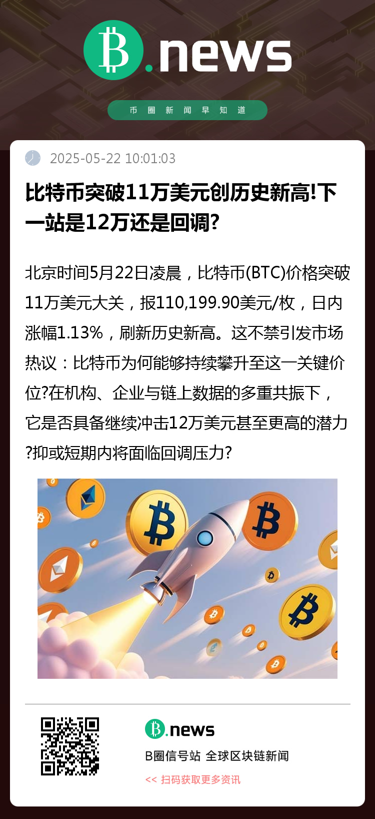 北京时间5月22日凌晨,比特币(BTC)价格突破11万美元大关,报110,199.90美元/枚,日内涨幅1.13%,刷新历史新高。这不禁引发市场热议:比特币为何能够持续攀升至这一关键价位?在机构、企业与链上数据的多重共振下,它是否具备继续冲击12万美元甚至更高的潜力?抑或短期内将面临回调压力?