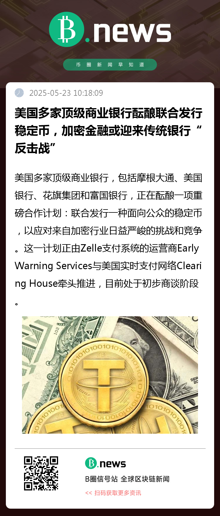 据《华尔街日报》最新报道,美国多家顶级商业银行,包括摩根大通、美国银行、花旗集团和富国银行,正在酝酿一项重磅合作计划:联合发行一种面向公众的稳定币,以应对来自加密行业日益严峻的挑战和竞争。