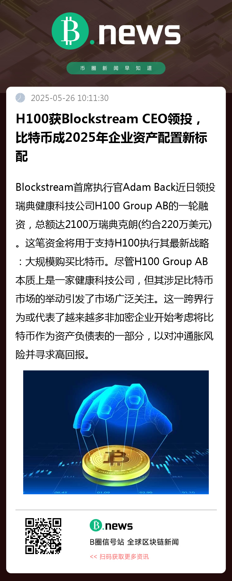 本轮融资中,Adam Back个人出资约140万美元,其余资金来自Morten Klein等投资方和家族办公室。H100表示,此举将支持其在5月22日宣布的比特币投资计划,并已开始实施比特币购入。