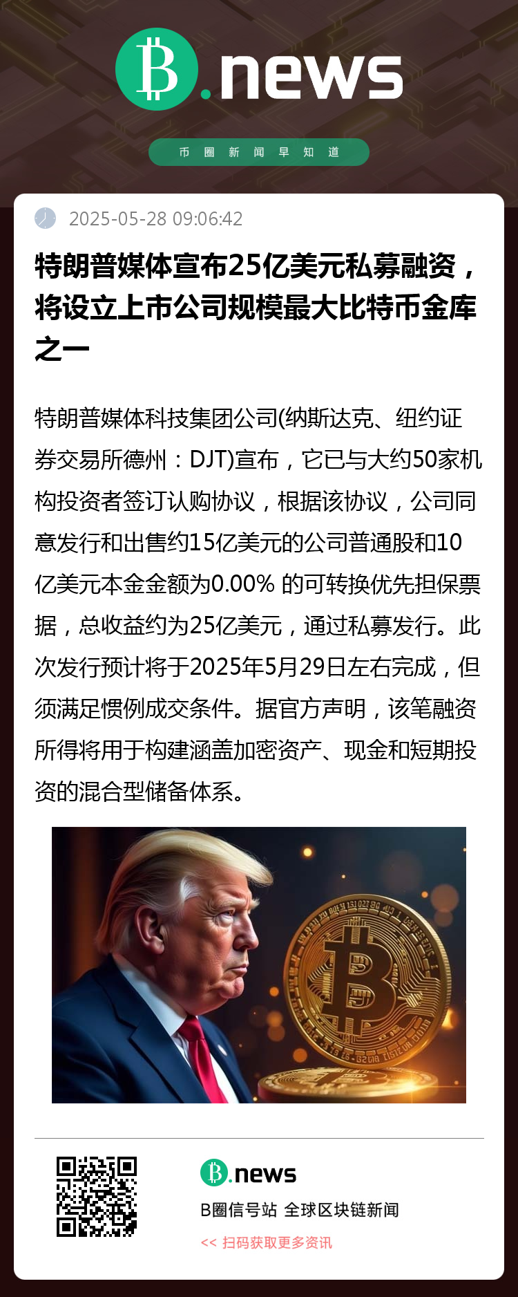 特朗普媒体科技集团(Trump Media & Technology Group, 纳斯达克代码:DJT)宣布,已与约50家机构投资者签订认购协议,将通过私募发行方式募集约25亿美元。此次融资包括约15亿美元普通股和10亿美元0%利率的可转换优先担保票据,将于2025年5月29日左右完成,前提是满足常规成交条件。