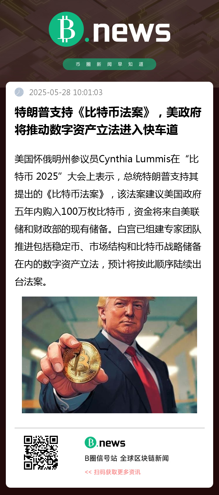 在近日于内华达州举行的“比特币 2025”大会上,美国怀俄明州参议员Cynthia Lummis公开表示,总统唐纳德·特朗普已明确支持她重新提出的《比特币法案》,并正在白宫内设立专家团队,筹备在未来几周内推出一揽子数字资产立法,涵盖稳定币、市场结构及比特币战略储备等多个维度。
