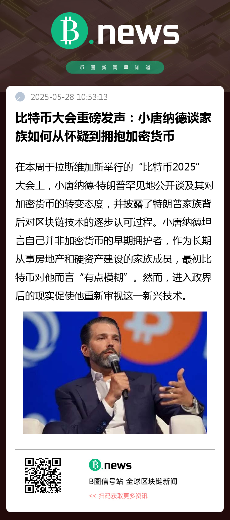 在本周于拉斯维加斯举行的“比特币2025”大会上,小唐纳德·特朗普(Donald Trump Jr.)罕见地公开谈及其对加密货币的转变态度,并披露了特朗普家族背后对区块链技术的逐步认可过程。
