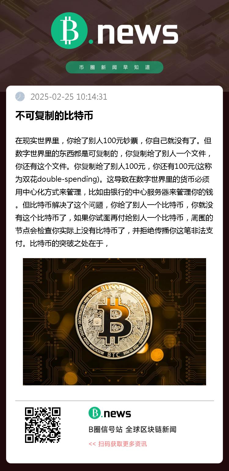 但比特币解决了这个问题,你给了别人一个比特币,你就没有这个比特币了,如果你试图再付给别人一个比特币,周围的节点会检查你实际上没有比特币了,并拒绝传播你这笔非法支付。比特币的突破之处在于,第一次在数字世界创造了一种即不可复制,又不是中心化的东西。比特币和电子化的法币是完全不同的东西,比特币是首次出现的,真正的数字货币。
