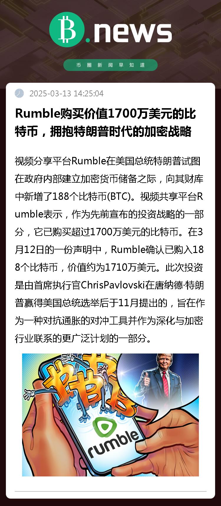视频分享平台Rumble在美国总统特朗普试图在政府内部建立加密货币储备之际,向其财库中新增了188个比特币(BTC)。
