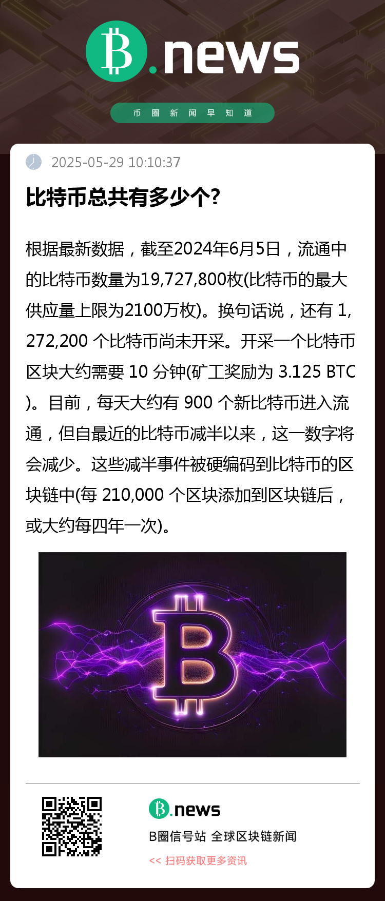 根据最新数据,截至2024年6月5日,流通中的比特币数量为19,727,800枚(比特币的最大供应量上限为2100万枚)。