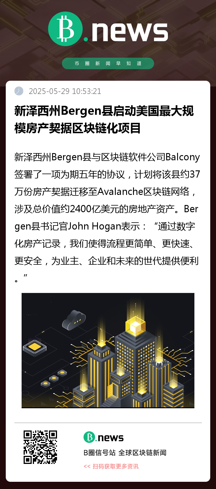 近日,新泽西州Bergen县与区块链软件公司Balcony签署了一项为期五年的协议,计划将该县约37万份房产契据迁移至Avalanche区块链网络,涉及总价值约2400亿美元的房地产资产。