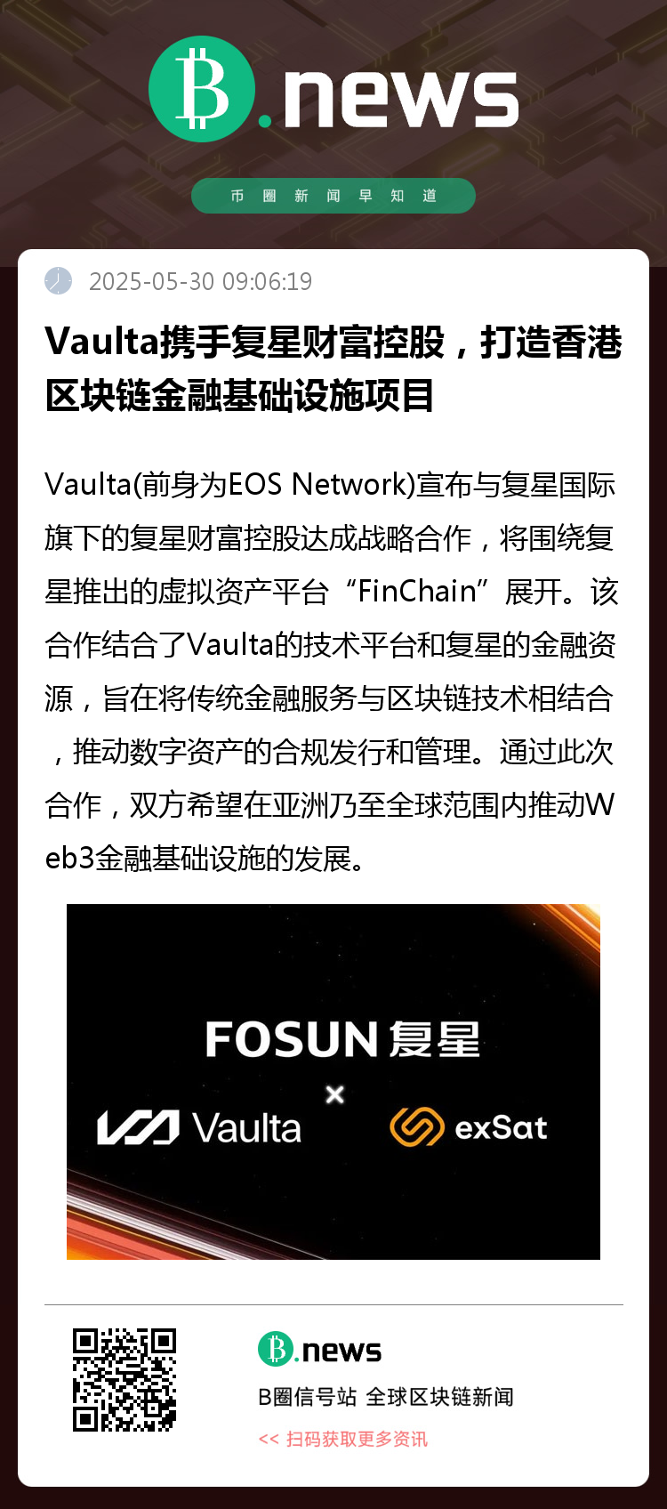 Vaulta(前身为EOS Network)宣布与复星国际旗下的复星财富控股达成战略合作,将围绕复星推出的虚拟资产平台“FinChain”展开。该合作结合了Vaulta的技术平台和复星的金融资源,旨在为香港及亚洲地区的金融服务引入区块链技术。