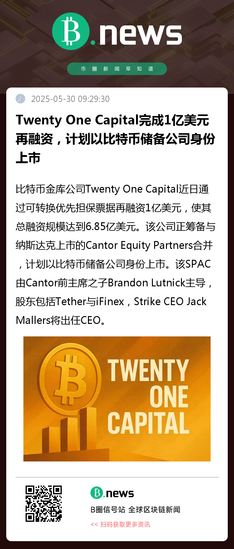 比特币金库公司Twenty One Capital近日通过可转换优先担保票据再融资1亿美元,使其总融资规模达到6.85亿美元。该公司正筹备与纳斯达克上市的Cantor Equity Partners合并,计划以比特币储备公司身份上市。该SPAC由Cantor前主席之子Brandon Lutnick主导,股东包括Tether与iFinex,Strike CEO Jack Mallers将出任CEO。