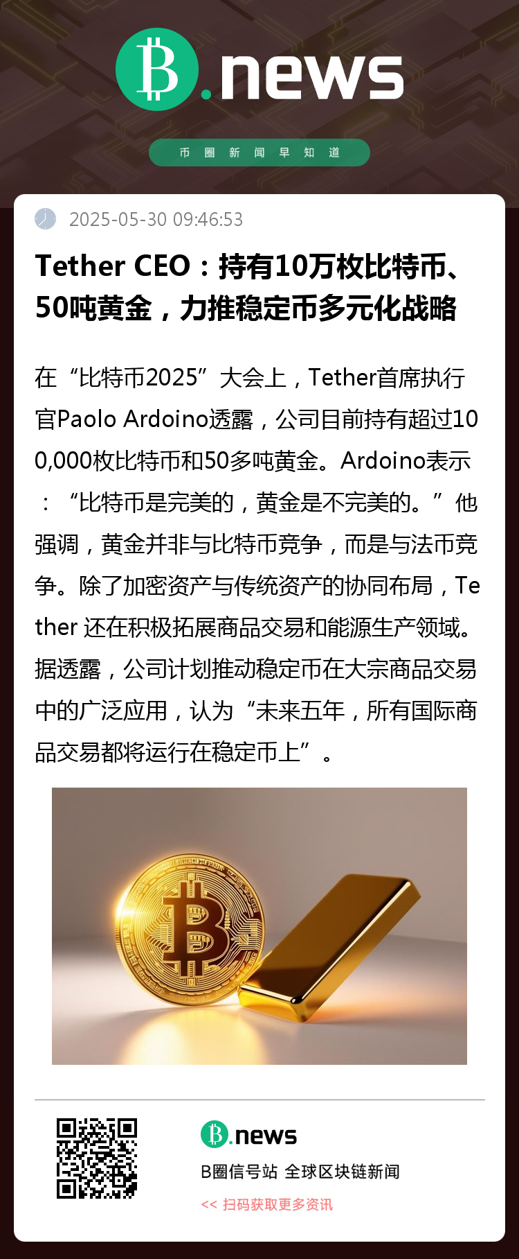 在“比特币2025”大会上,稳定币发行商 Tether 首席执行官 Paolo Ardoino 重磅披露,公司目前持有超过 100,000 枚比特币和逾 50 吨实物黄金。他强调:“比特币是完美的,黄金是不完美的。”并指出,黄金并非与比特币竞争,而是与法币竞争。