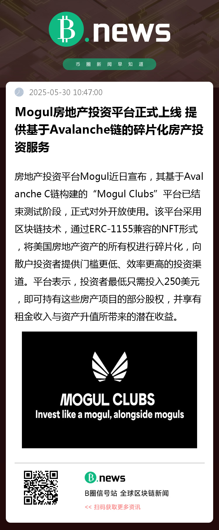 房地产投资平台Mogul近日宣布,其基于Avalanche C链构建的“Mogul Clubs”平台已结束测试阶段,正式对外开放使用。该平台采用区块链技术,通过ERC-1155兼容的NFT形式,将美国房地产资产的所有权进行碎片化,向散户投资者提供门槛更低、效率更高的投资渠道。