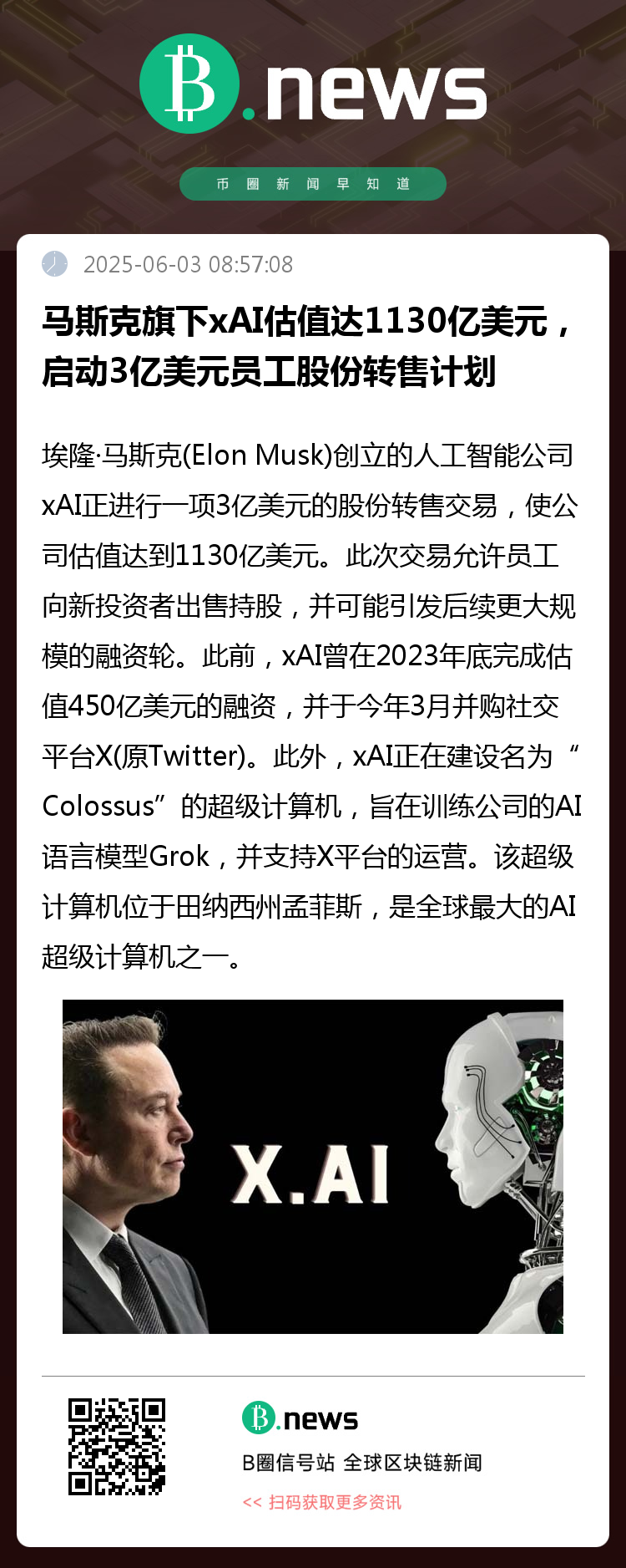 据报道,埃隆·马斯克(Elon Musk)创立的人工智能公司xAI正进行一项3亿美元的股份转售交易,使公司估值达到1130亿美元。此次交易允许员工向新投资者出售持股,并可能引发后续更大规模的融资轮。此前,xAI曾在2023年底完成估值450亿美元的融资,并于今年3月并购社交平台X(原Twitter)。