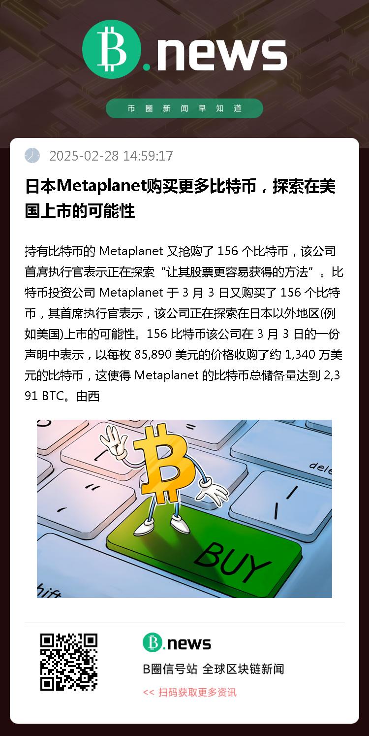 比特币投资公司 Metaplanet 于 3 月 3 日又购买了 156 个比特币,其首席执行官表示,该公司正在探索在日本以外地区(例如美国)上市的可能性。