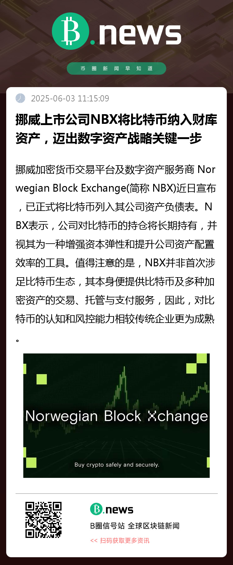 挪威加密货币交易平台及数字资产服务商 Norwegian Block Exchange(简称 NBX)近日宣布,已正式将比特币列入其公司资产负债表。这一举措使NBX成为挪威首家公开上市、将比特币作为财库资产的公司。