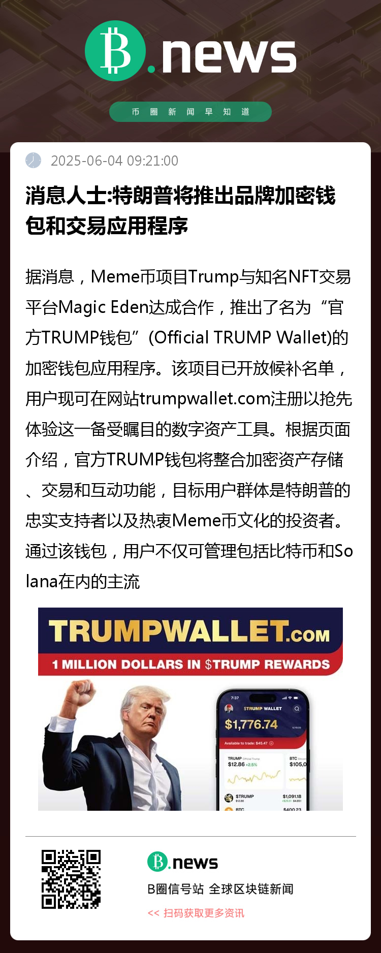 据官方网站消息,Meme币项目Trump与知名NFT交易平台Magic Eden达成合作,推出了名为“官方TRUMP钱包”(Official TRUMP Wallet)的加密钱包应用程序。该项目已开放候补名单,用户现可在网站trumpwallet.com注册以抢先体验这一备受瞩目的数字资产工具。