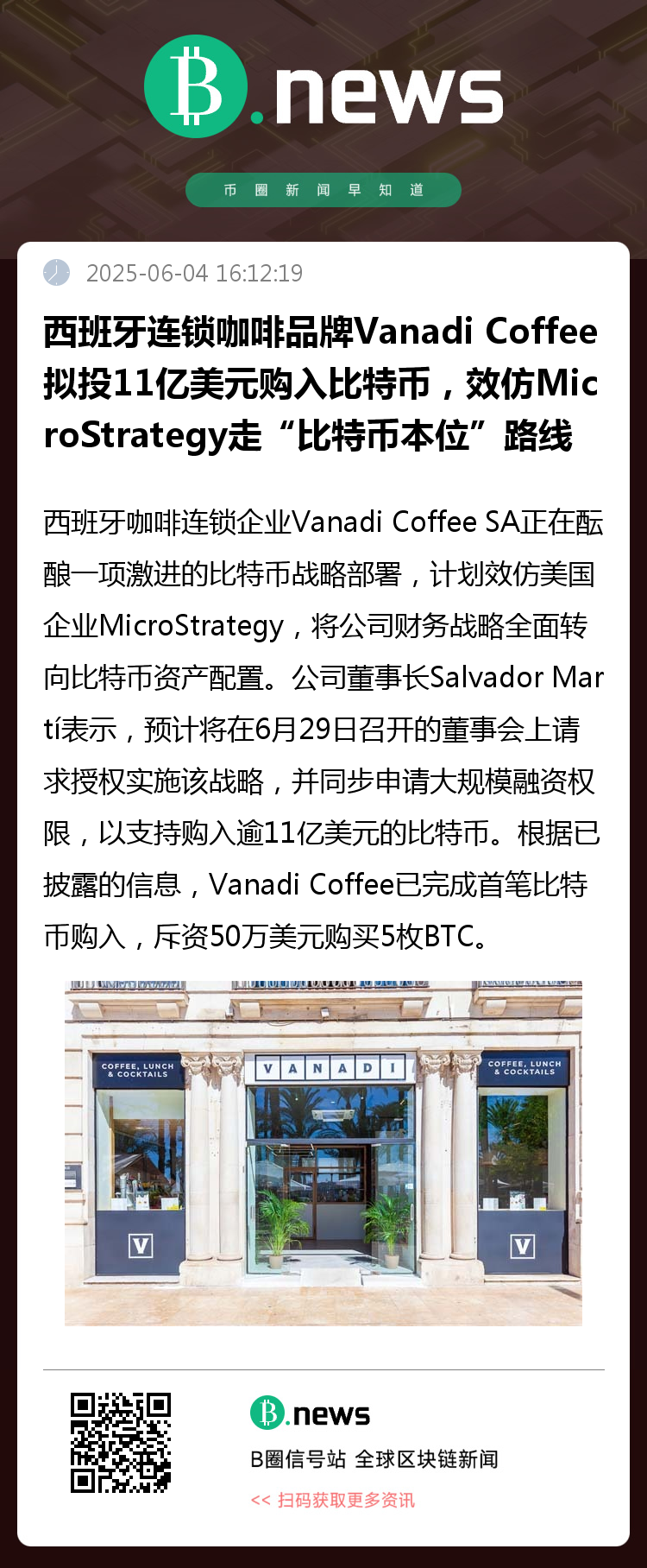 如果董事会在6月正式批准相关提案,Vanadi Coffee将成为欧洲首批大规模实施比特币储备战略的上市公司之一。Martí强调,此战略不仅是“对当前宏观经济环境的积极响应”,更是公司“数字时代生存转型的关键一步”。