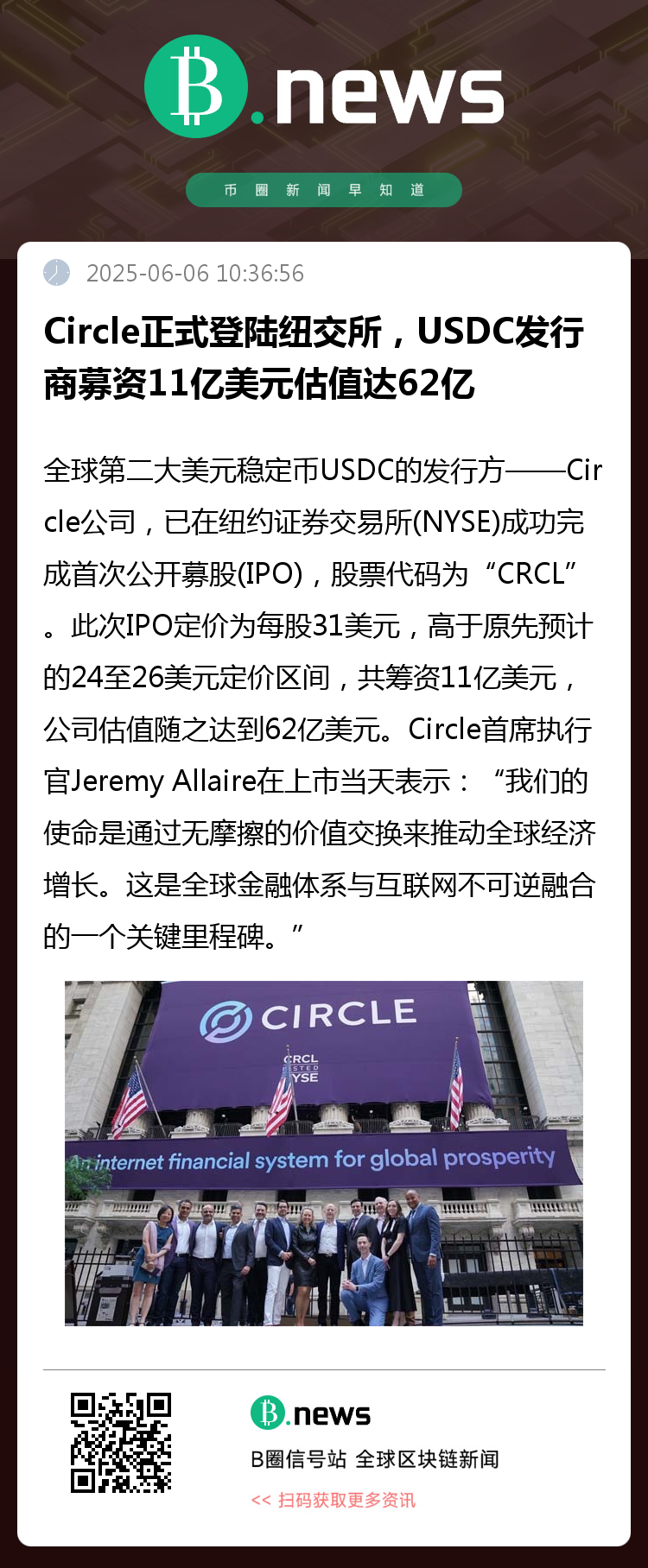 Circle首席执行官Jeremy Allaire在上市当天表示:“我们的使命是通过无摩擦的价值交换来推动全球经济增长。这是全球金融体系与互联网不可逆融合的一个关键里程碑。”