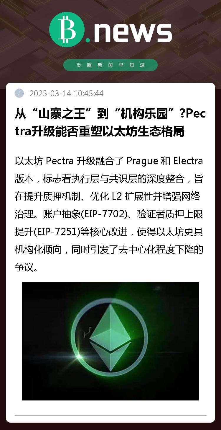以太坊 Pectra 升级融合了 Prague 和 Electra 版本,标志着执行层与共识层的深度整合,旨在提升质押机制、优化 L2 扩展性并增强网络治理。账户抽象(EIP-7702)、验证者质押上限提升(EIP-7251)等核心改进,使得以太坊更具机构化倾向,同时引发了去中心化程度下降的争议。