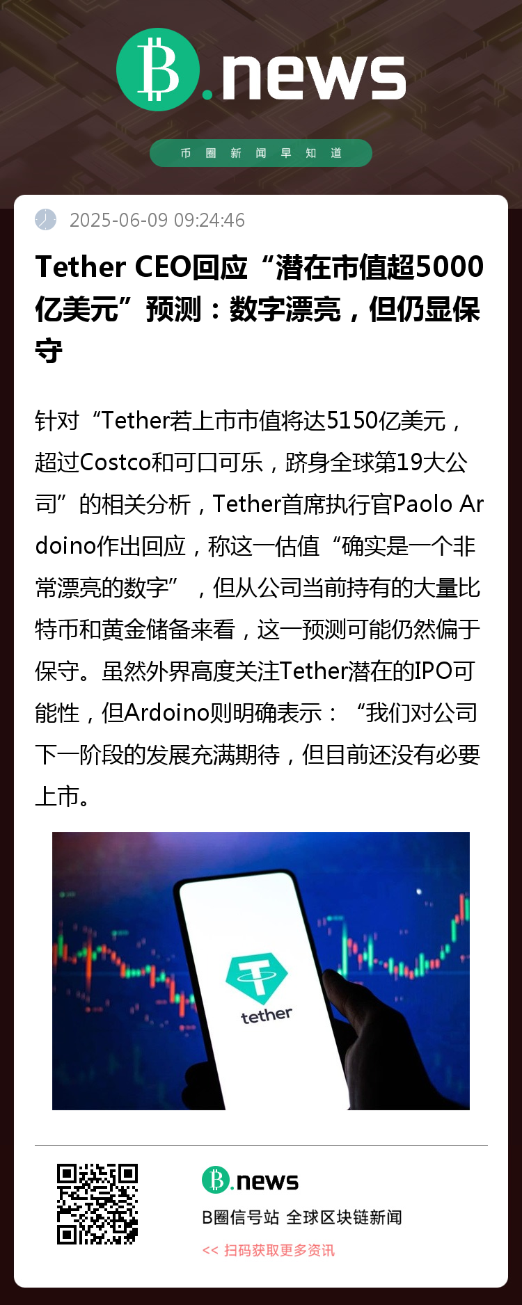 虽然外界高度关注Tether潜在的IPO可能性,但Ardoino则明确表示:“我们对公司下一阶段的发展充满期待,但目前还没有必要上市。”这一表态表明,Tether更倾向于通过内部积累和全球布局来推进长期增长,而非依赖资本市场的短期助力。