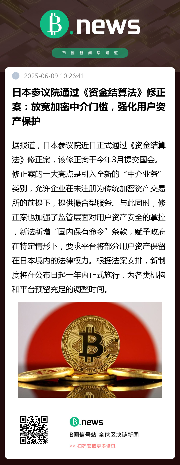 据报道,日本参议院近日正式通过《资金结算法》修正案,为加密货币行业带来重大制度变革。该修正案于今年3月提交国会,旨在顺应金融服务数字化趋势,兼顾用户权益保护与产业创新发展。