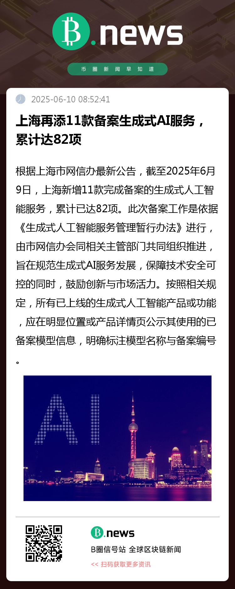 为加快建设人工智能高地,上海市在生成式人工智能领域持续推进合规与创新双轮驱动。根据上海市网信办最新公告,截至2025年6月9日,上海新增11款完成备案的生成式人工智能服务,累计已达82项。这一进展标志着本地AI产业生态持续扩展,也凸显了上海在推动新技术落地应用方面的积极姿态。
