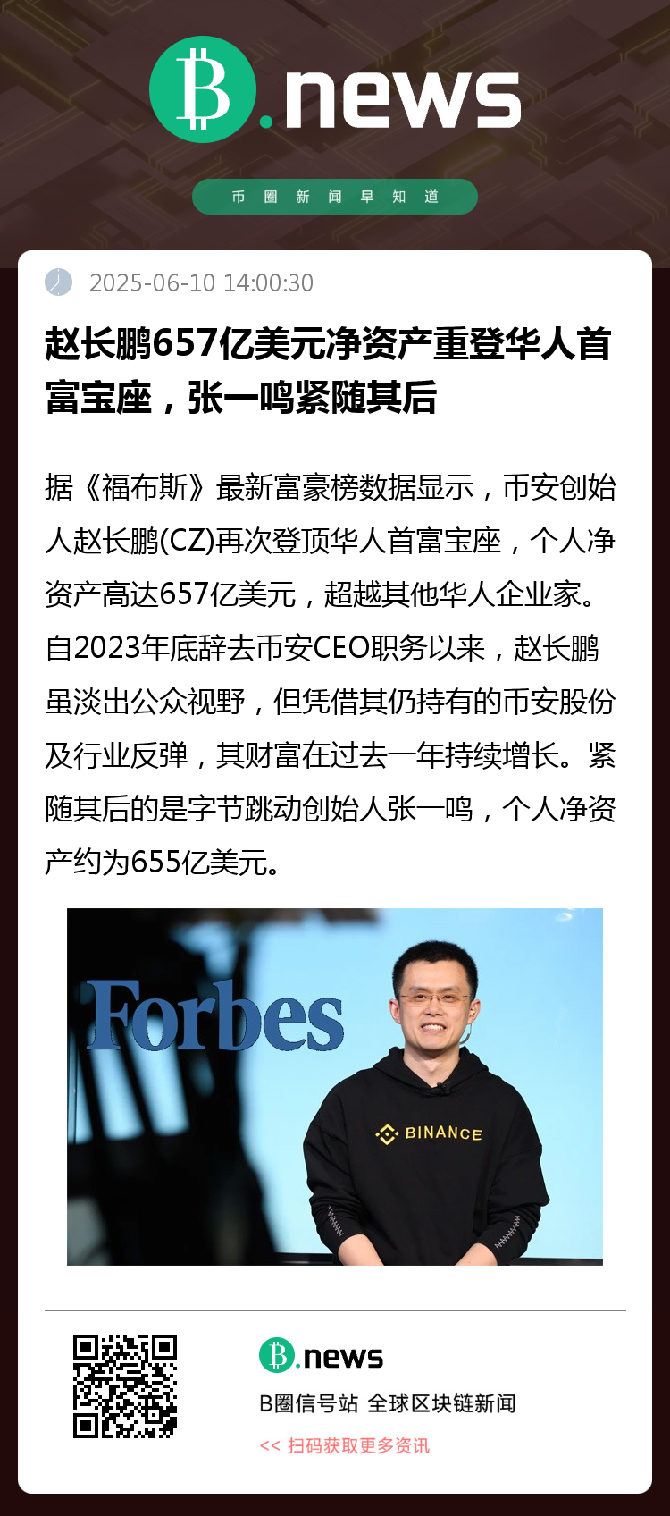 据《福布斯》最新富豪榜数据显示,币安创始人赵长鹏(CZ)再次登顶华人首富宝座,个人净资产高达657亿美元,超越其他华人企业家。