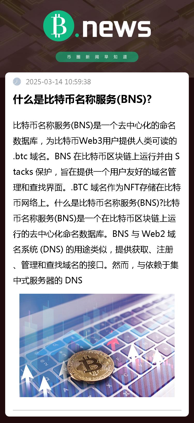 比特币名称服务(BNS)是一个去中心化的命名数据库,为比特币Web3用户提供人类可读的 .btc 域名。