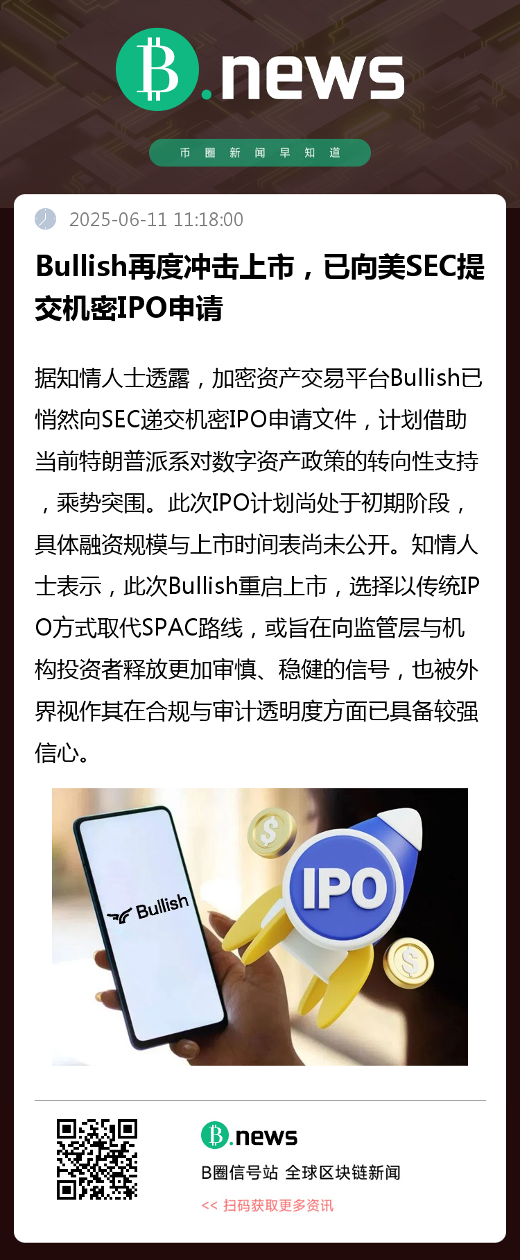 知情人士表示,此次Bullish重启上市,选择以传统IPO方式取代SPAC路线,或旨在向监管层与机构投资者释放更加审慎、稳健的信号。近年来,美国证券监管机构对加密行业审查日益严格,能够成功走通IPO流程的交易所屈指可数。Bullish此举,也被外界视作其在合规与审计透明度方面已具备较强信心。