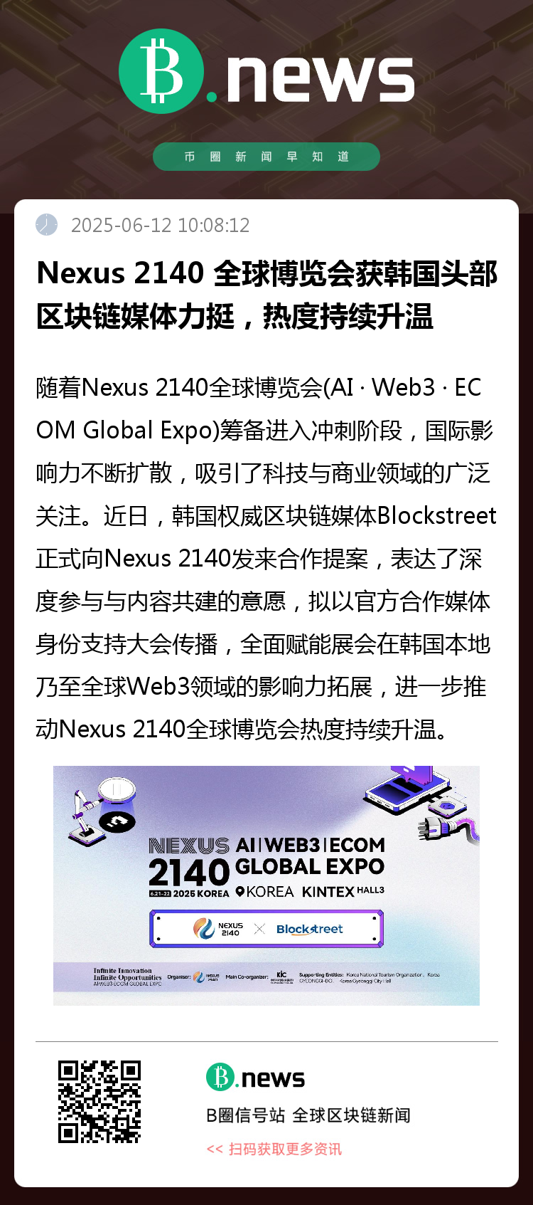 随着 Nexus 2140 全球博览会(AI · Web3 · ECOM Global Expo)筹备进入冲刺阶段,国际影响力不断扩散,吸引了科技与商业领域的广泛关注。作为 2025 年全球最受瞩目的科技商业盛会之一,Nexus 2140 不仅在全球范围内吸引了顶尖项目与资本的集结,也在韩国本土市场引发了高度热议。近日,韩国权威区块链媒体 Blockstreet 正式向 Nexus 2140 发来合作提案,表达了深度参与与内容共建的意愿,拟以官方合作媒体身份支持大会传播,全面赋能展会在韩国本地乃至全球 Web3 领域的影响力拓展,进一步推动 Nexus 2140 全球博览会热度持续升温。
