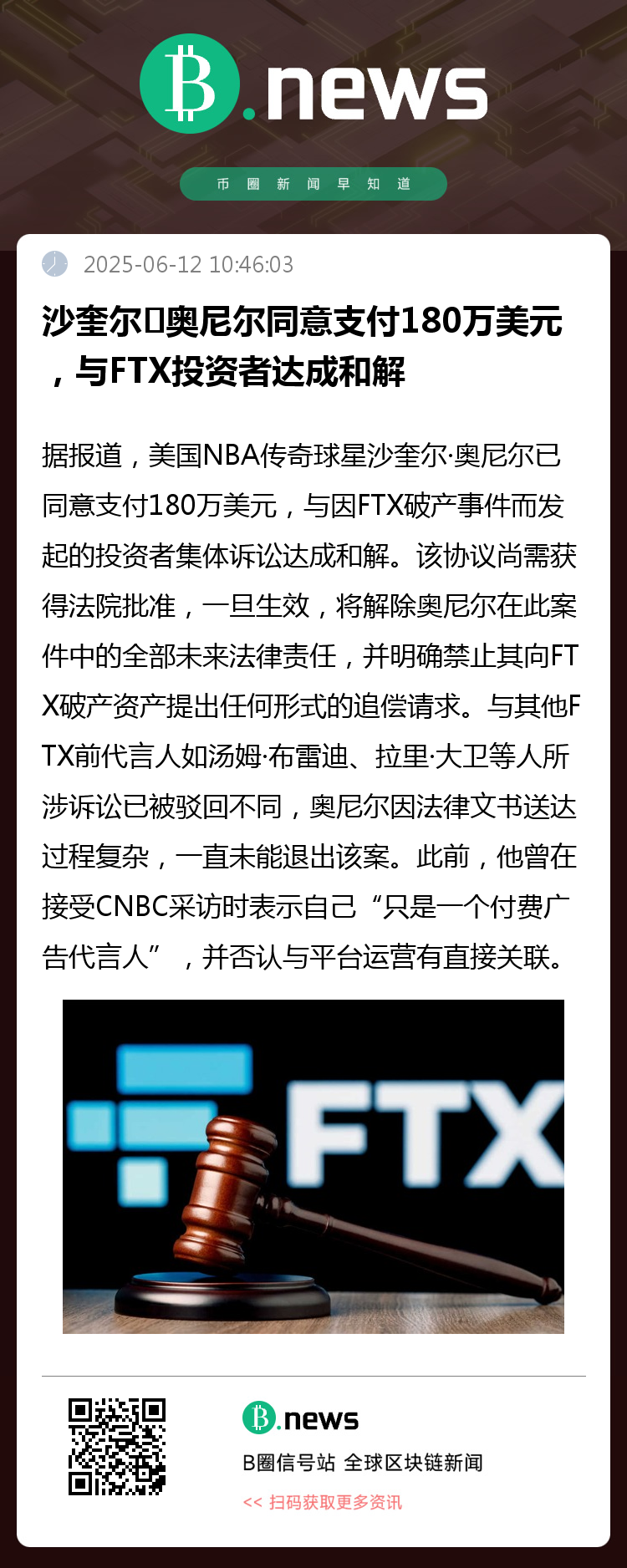 与其他FTX前代言人如汤姆·布雷迪、拉里·大卫等人所涉诉讼已被驳回不同,奥尼尔因法律文书送达过程复杂,一直未能退出该案。此前,他曾在接受CNBC采访时表示自己“只是一个付费广告代言人”,并否认与平台运营有直接关联。