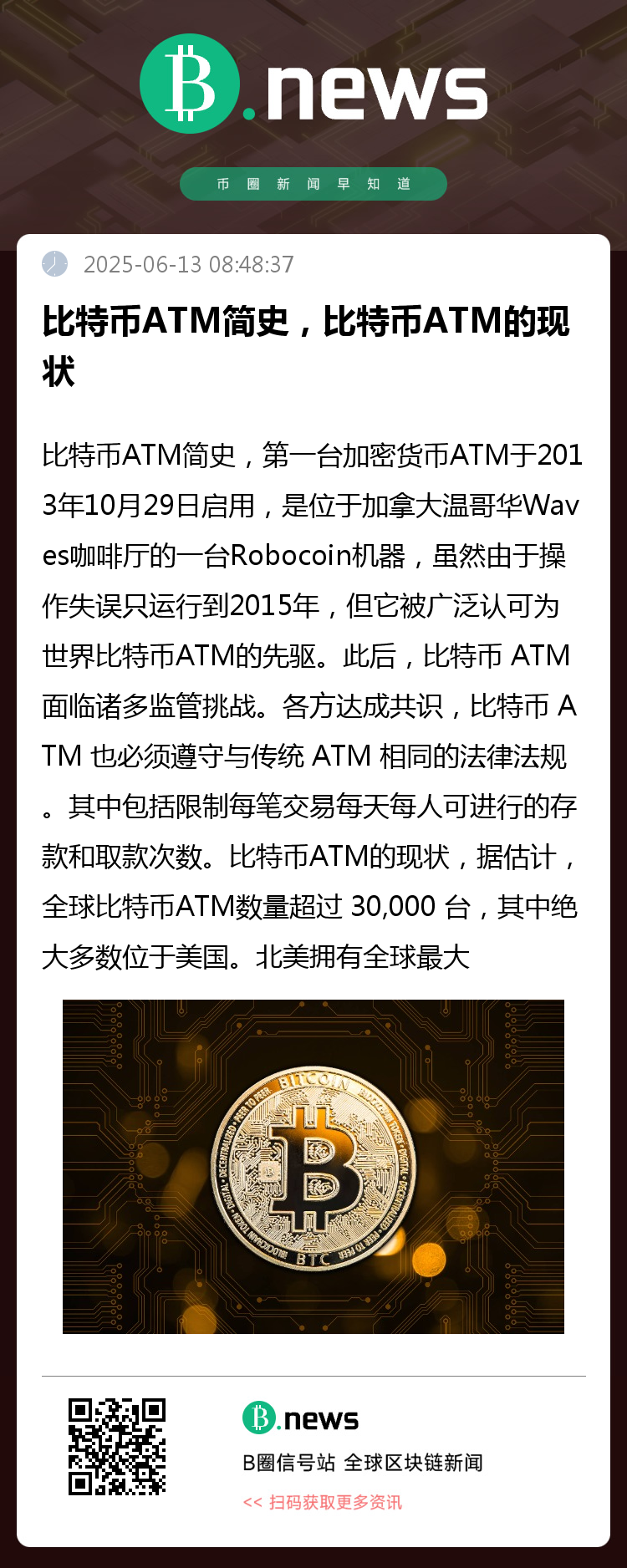 比特币ATM简史,第一台加密货币ATM于2013年10月29日启用,是位于加拿大温哥华Waves咖啡厅的一台Robocoin机器,虽然由于操作失误只运行到2015年,但它被广泛认可为世界比特币ATM的先驱。