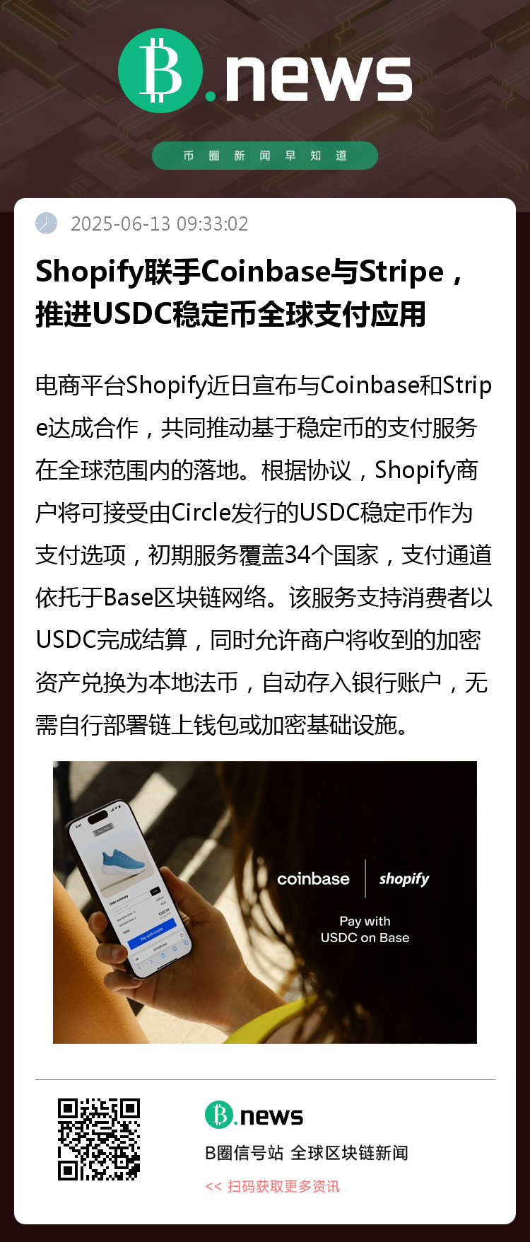 电商平台Shopify近日宣布与Coinbase和Stripe达成合作,共同推动基于稳定币的支付服务在全球范围内的落地。根据协议,Shopify商户将可接受由Circle发行的USDC稳定币作为支付选项,初期服务覆盖34个国家,支付通道依托于Base区块链网络。