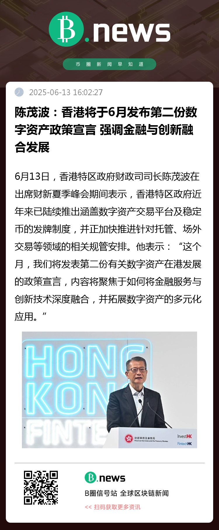 6月13日,香港特区政府财政司司长陈茂波在出席财新夏季峰会期间表示,香港将在本月公布第二份有关数字资产发展的政策宣言,继续推动金融科技与创新融合,拓展数字资产在港应用的具体场景。