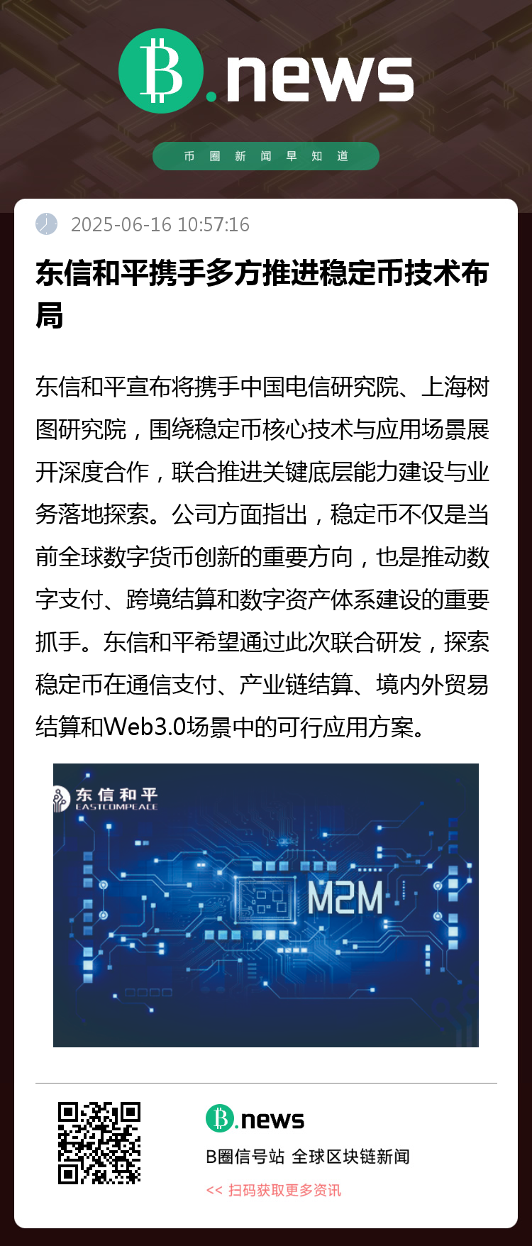 在此背景下,东信和平宣布将携手中国电信研究院、上海树图研究院,围绕稳定币核心技术与应用场景展开深度合作,联合推进关键底层能力建设与业务落地探索。