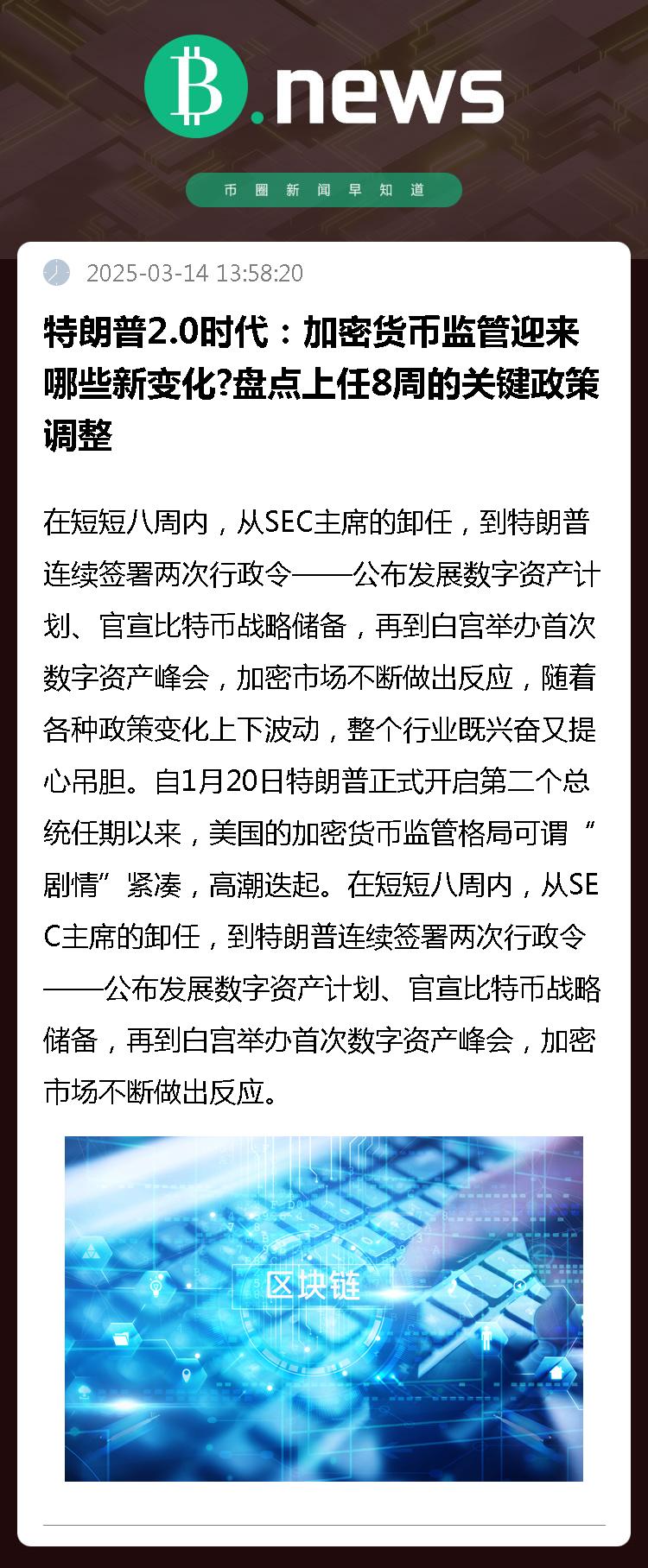 自1月20日特朗普正式开启第二个总统任期以来,美国的加密货币监管格局可谓“剧情”紧凑,高潮迭起。在短短八周内,从SEC主席的卸任,到特朗普连续签署两次行政令——公布发展数字资产计划、官宣比特币战略储备,再到白宫举办首次数字资产峰会,加密市场不断做出反应,随着各种政策变化上下波动,可以说,整个行业既兴奋又提心吊胆。